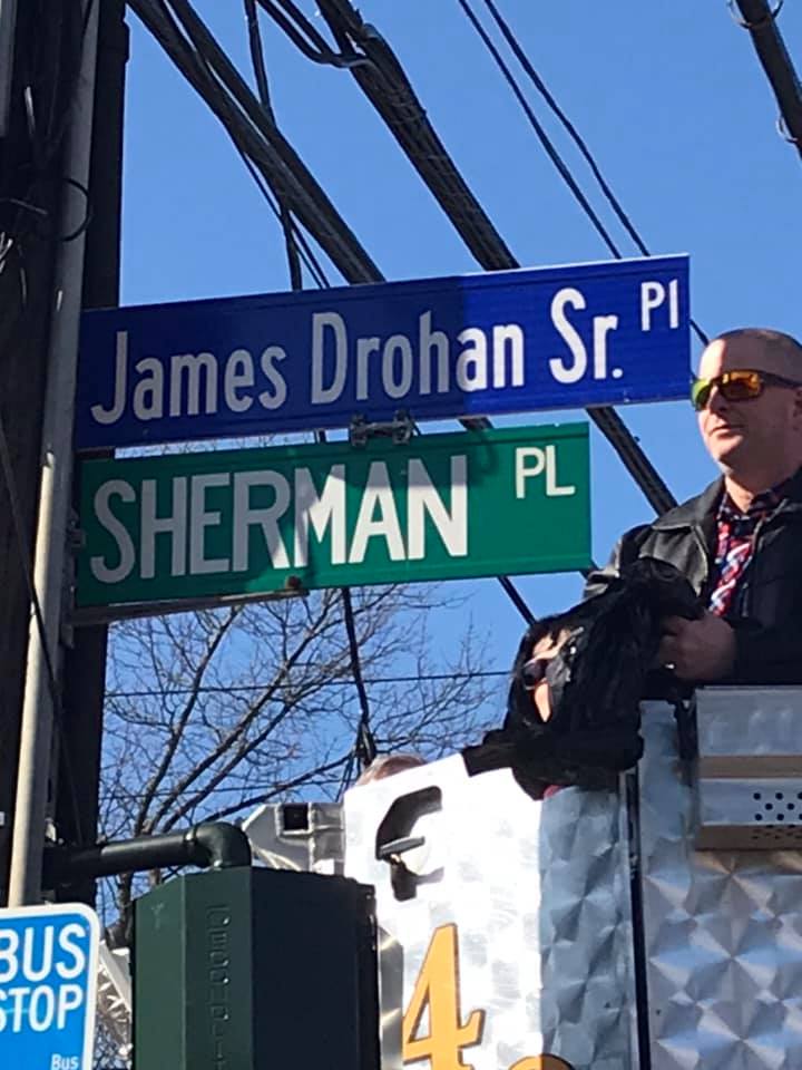 James Drohan Jr, proudly unveiling the street sign bearing his father’s name – James Drohan Sr. Place.James Drohan, Sr. was my husband’s best friend, having worked with Jim for many years at AIG. They ate lunch together every day, laughed and cried together, and became almost inseparable. Jim treated my kids as his own, and always called with silly ways to make me laugh. I miss him terribly, but I was honored by his friendship and by attending his street naming. ❤